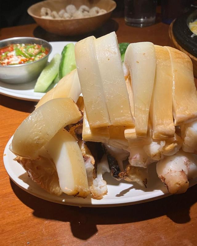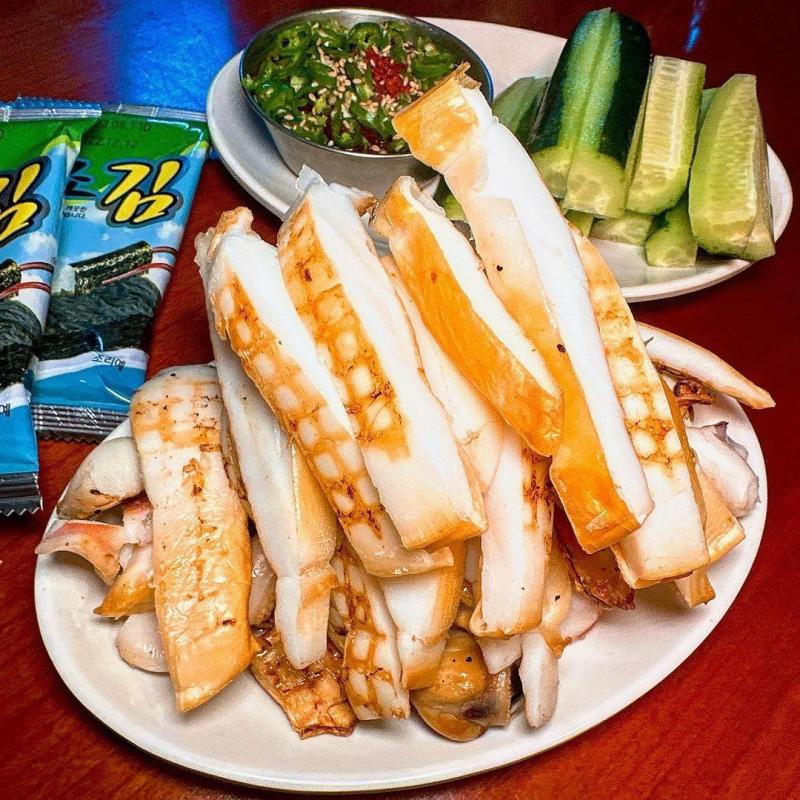 핵 두툼한 갑오징어구이 사진 하나 보고 홀리듯 방문한 충무로 맛집. 따끈쫄깃 씹으면 씹을수록 감칠맛 나는 갑오징어를 알맞게 구워주신다. 몸통은 쫠깃, 다리는 좀 더 바삭한 편. 오이와 특제소스, 김이 함께 나오는데, 김에 싸서 특제소스 발라먹다가 입가심으로 오이를 먹으면 다시 입이 개운하게 리셋되서 처음과 같은 감동으로 끝까지 먹을 수 있다.
