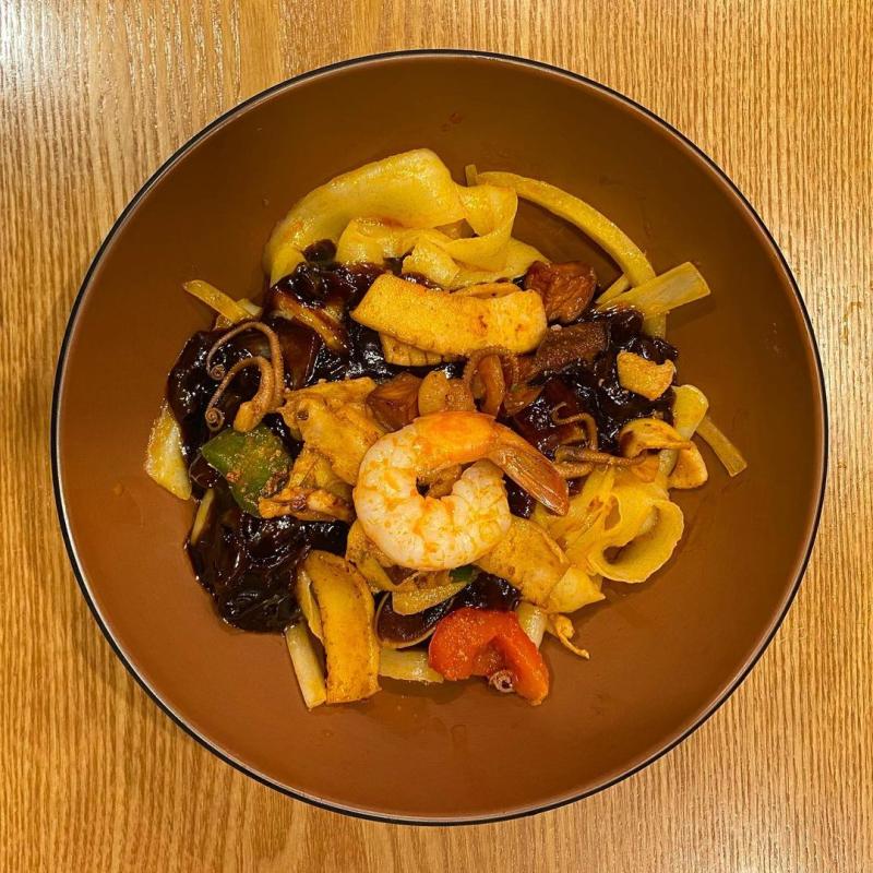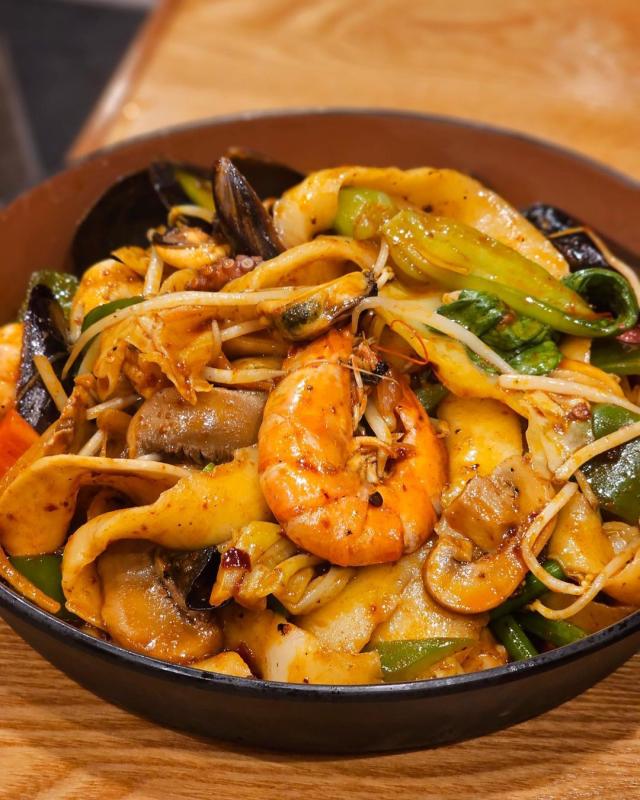 마라해물볶음도삭면 은 마라 베이스의 해물볶음 요리에
