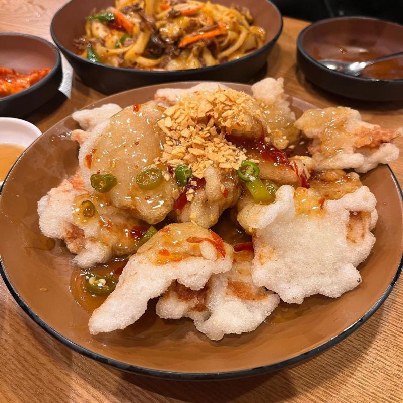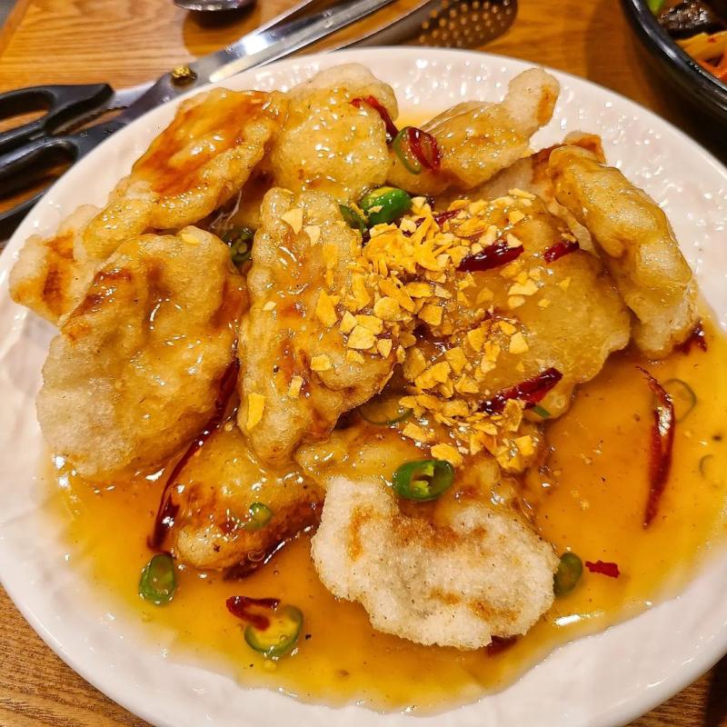 도삭면에 꿔바로가 빠지면 섭하죠. 사천 꿔바로는 숭덩숭덩 한입 딱 먹어줬는데 쫜득 빠삭한 식감부터 이미 미간 잔뜩 찌푸려지구요,,소스는 달달하고,, 바삭한 양파 후레이크와 고추가 들어가서 살짝의 알싸하고 매콤함이 감도는게,, 아주 맛나요.