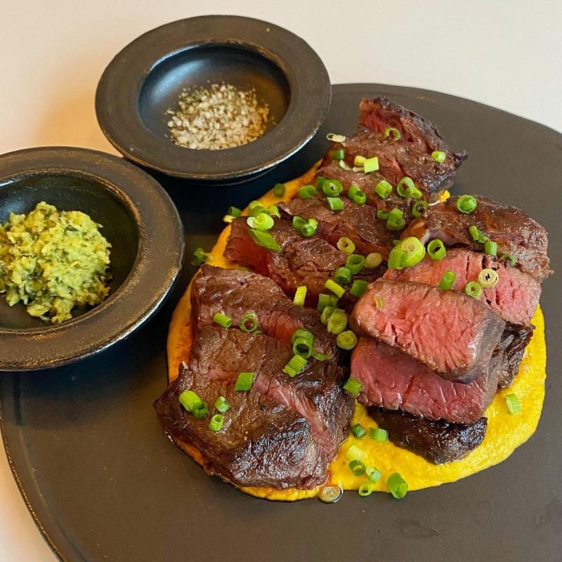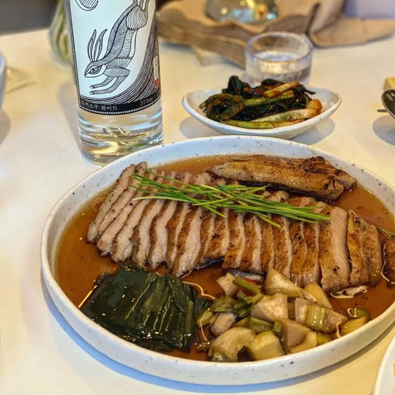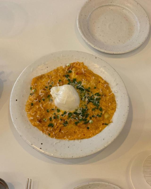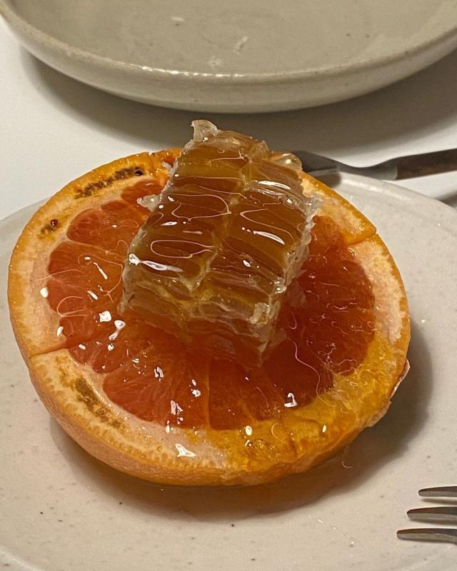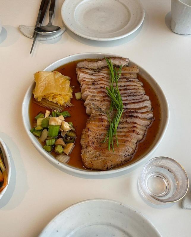 메뉴: 구운 알배추, 전복장 들기름 메밀국수, 부라타 치즈를 얹은 누룽지리조또, 수비드 항정 수육 (파김치를 곁들인..), 꿀자몽, 레몬홍시셔벗